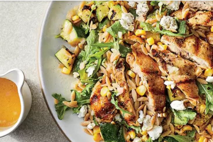 Grilled chicken and grilled vegetables make this delicious orzo salad complete.