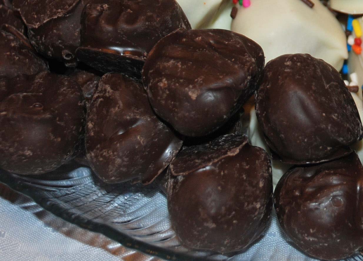 Once set, scoop out into even 1 teaspoon portions and roll into balls (this is messy - may want to consider using gloves for this part) and place on waxed paper on tray or cookie sheet. Place back in fridge for at least 10-15 minutes (or as long as overnight, if covered) to chill slightly before dipping in chocolate.