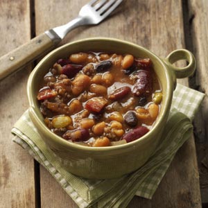 This saucy dish is flavorful and filling, chock-full of ground beef, bacon and a variety of beans.