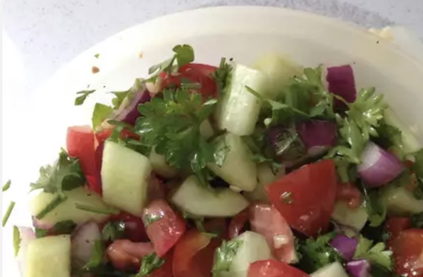 Cucumbers, tomatoes, onion, and seasonings tossed with homemade lemon and olive oil dressing.
