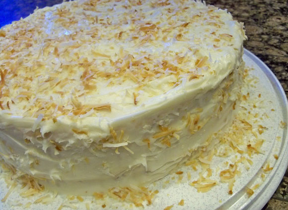 In frying pan, toast coconut in a little butter (or toast coconut in oven on baking tray at 425 degrees F for about 5 minutes). Sprinkle toasted coconut on top of cake.