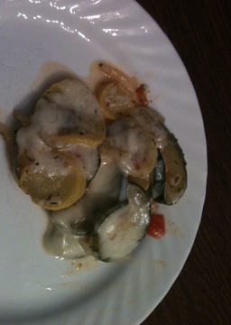 Saute squash, onion, and tomato in butter for 5 minutes. Add Italian seasoning, salt, and pepper. Cover and simmer until squash is tender. Sprinkle with grated mozzarella cheese. Return lid and remove from heat. Allow cheese to melt and serve.