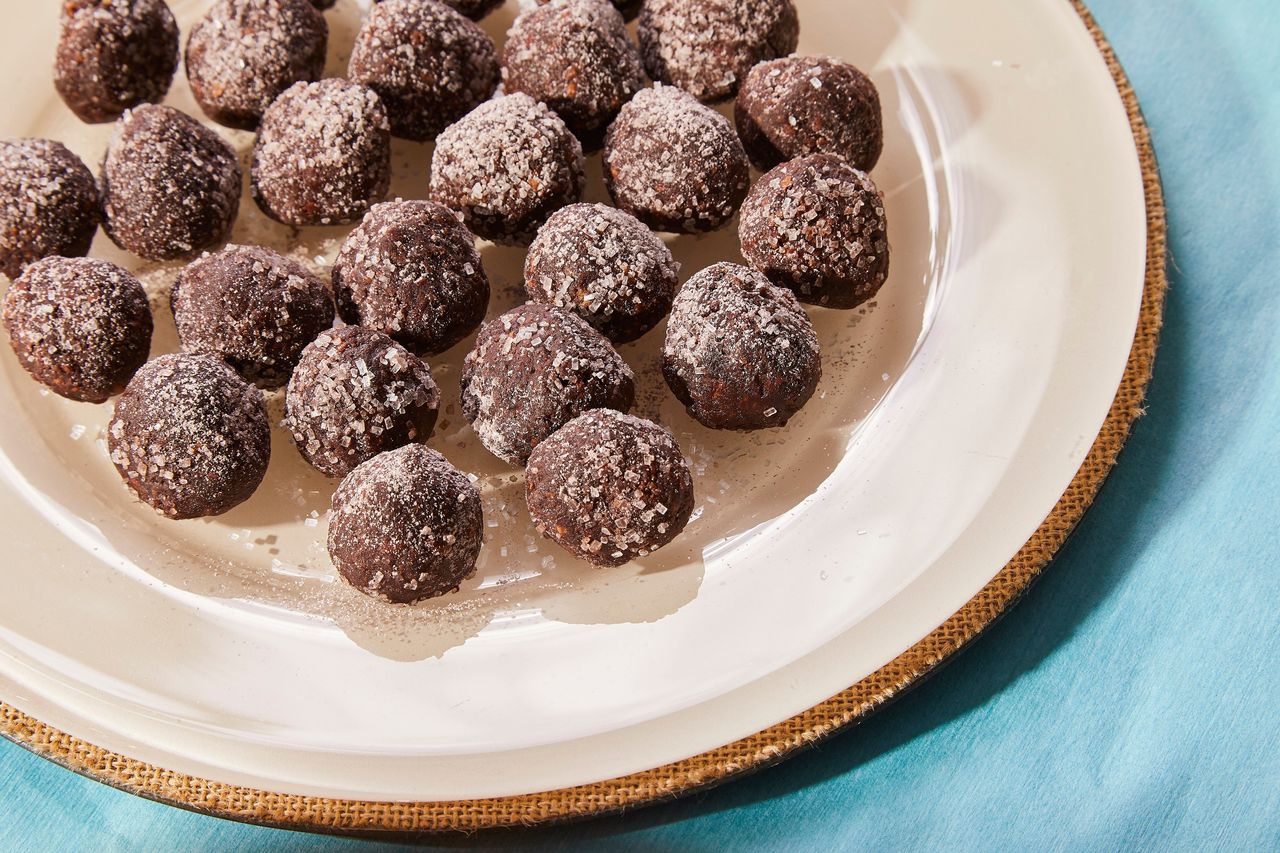 5. Coating Option 2: Combine remaining cocoa powder and confectioners’ sugar in a wide bowl. Place sanding or turbinado sugar in a second wide bowl. Roll each ball first in cocoa sugar, then in sanding sugar, pressing slightly to insure the coating sticks. Transfer balls to a parchment-lined rimmed baking sheet. Refrigerate until firm, 2 hours. These can be stored in a closed container in the refrigerator for 3 days.