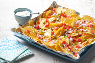 DOUBLE-FOLD edges of large sheet of heavy-duty foil to make rimmed 12x10-inch tray. Spread chips onto bottom of tray; cover with cheese, onions and peppers.