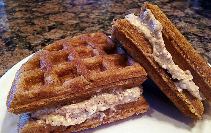 5. Cut waffle into quarters and spread cream cheese evenly over half the waffle.