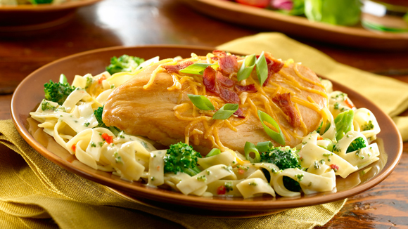 Stir sour cream into Pasta, then spoon onto serving platter. Top with chicken, then cheese, bacon and green onion.
