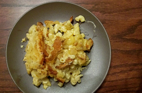 Melt the remaining 2 tablespoons of butter or margarine; combine with the fresh bread crumbs (make bread crumbs by lightly toasting bread and crumbling into a small bowl), and sprinkle this mixture on top of macaroni in dish. Bake uncovered 30-35 minutes or until sauce is bubbly and macaroni is browned on top.
