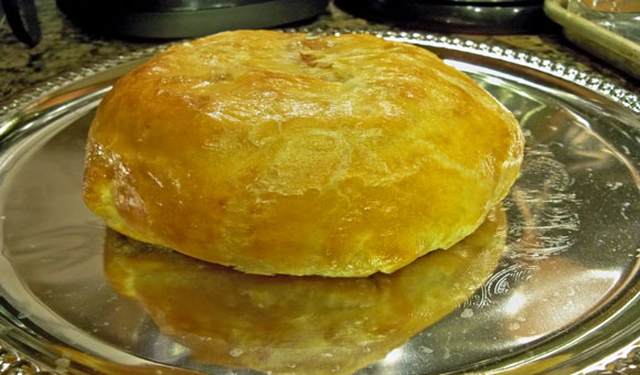 Thaw, unfold and roll puff pastry to 10 ½" x 10 ½" square. Cut a 10 ½" circle from pastry. Put jelly and nuts on top of cheese and press in lightly. Place pastry circle over cheese; invert cheese and pastry. Close bottom of cheese by pleating and pinching pastry while brushing with egg and water mixture. Place cheese round smooth side up on lightly greased baking sheet, brush with egg mixture. Cut small slits for steam to escape. Decorate with remaining pastry, if desired. Bake at 400 degrees F for 22-25 minutes or until golden brown. Cool for 20 to 30 minutes. Serve with fruit and crackers.