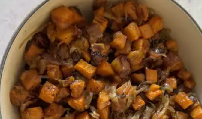 Maple Glazed Sweet Potatoes with Bacon and Caramelized Onions
