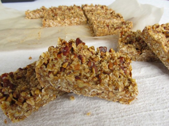 In a large bowl, combine chopped pecans, almond meal, rolled oats and salt. In a small pan melt the coconut oil and almond butter together. Remove the coconut oil and almond butter mixture from the stove. Add maple syrup and vanilla and stir until combined. Add the liquids to the dry ingredients and stir until everything is well coated. In a 9x9 pan lined with parchment paper, press the mixture into the pan. Place in the freezer and chill for 15-30 minutes (you could sneak them out in 15 if your freezer is really cold). Cut into 15 squares and wrap individually in plastic wrap. Store in the freezer.