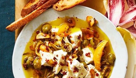 Break up goat cheese or feta cheese into pieces and arrange in shallow bowl or on platter. Spoon warm oil mixture over top and let sit for 10 minutes.