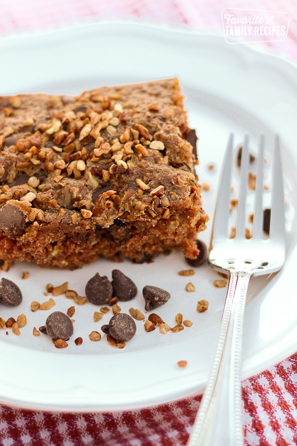 Chocolate chip picnic cake with chocolate chips and nuts on top; a favorite of friend, Mary Jo.