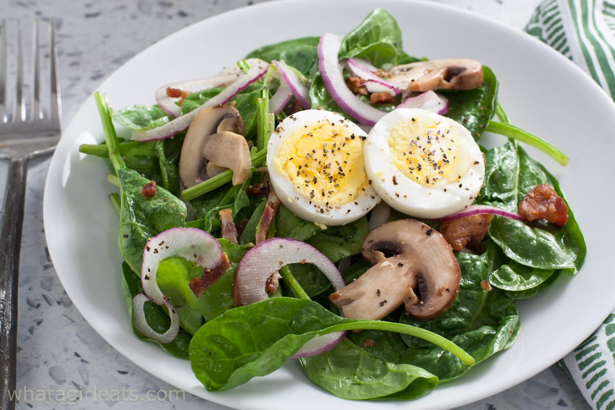 Mary Jo's spinach salad recipe with sliced fresh mushrooms, bacon, boiled eggs and stuffing, along with homemade dressing,