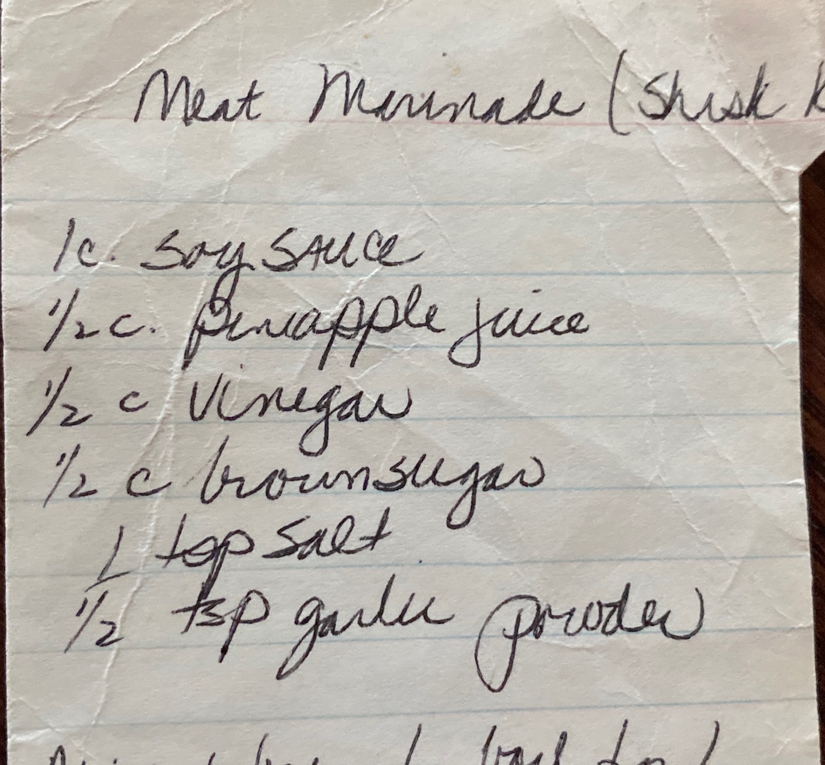 Soy sauce, pineapple juice, vinegar and brown sugar with seasonings for marinading stew meat or other beef.