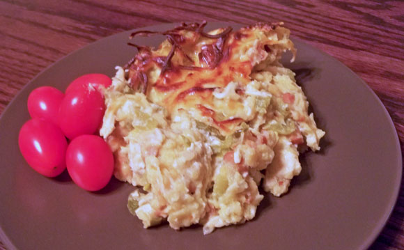 Chicken enchilada type casserole layered with chicken, green chiles, beans and cheese.
