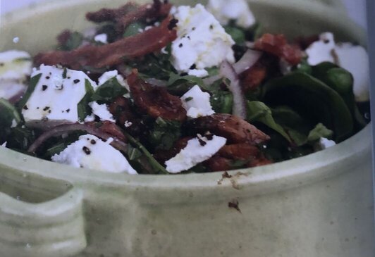 - Dress with the garlic, mint, red onion and 4 tablespoons olive oil, and season with salt, pepper and lemon juice to taste. Add in the bacon and sprinkle the feta on top