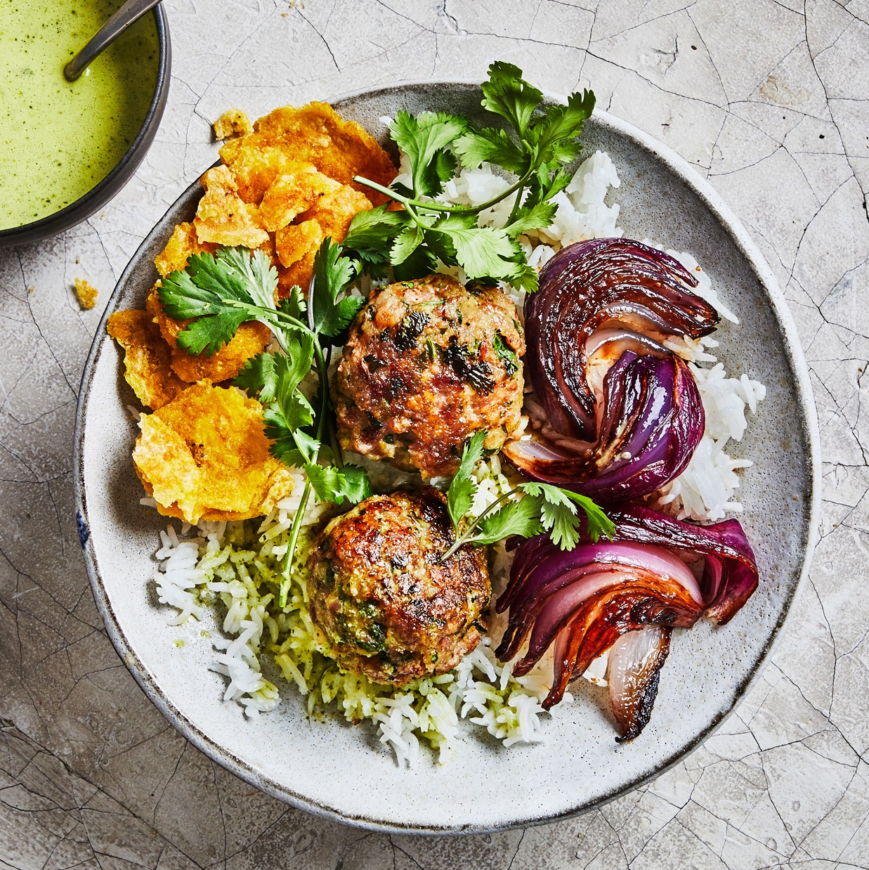 Divide rice among bowls and top with meatballs and onions, then plantain chips and more cilantro sprigs. Serve with sauce alongside.