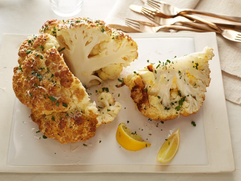 Cut the cauliflower into thick wedges and serve on plates with a sprinkle of salt, lemon wedges and any extra Parmesan mixture.