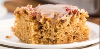 Mix together all of cake ingredients. Bake in greased 13 by 9 inch pan at 350 degrees F for 20 to 25 minutes.