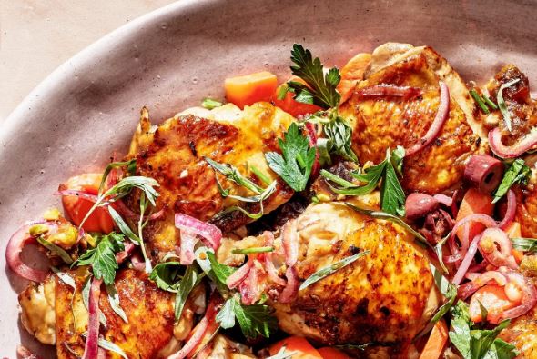 While the chicken is resting, toss together the red onion, lemon zest and juice, dates, pistachios, herbs, and olives in a medium bowl until combined. Season with salt.