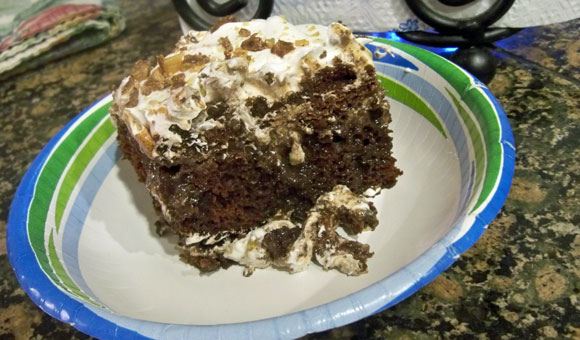 Prepare Devil's Food Cake as directed in a 9x13" pan. Cool 30 minutes. Thaw Cool Whip at room temperature. Poke holes in the top of the cake 1" deep and approx. 1/2" apart. Pour the sweetened condensed milk onto cake. Be sure an even amount of syrup goes into each hole. Pour Hershey's syrup over cake evenly, as well. Spread Cool Whip over the cake evenly all the way to the edges of the pan. Crush the Heath candy bars and sprinkle over the top.