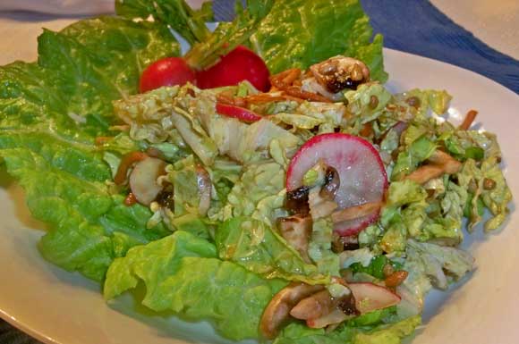 Chop cabbage, bok choy, onion, mushrooms and radishes and combine. Refrigerate, tightly covered. This can be done the day before using.