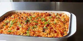 Baked rice casserole with mushrooms, peppers, celery and seasoning.