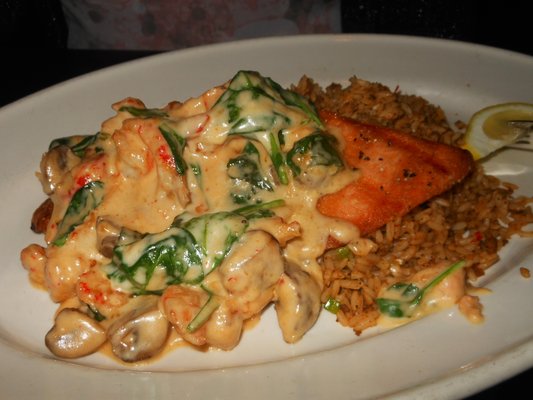 Place 2 ounces of grill butter (or regular butter) in saute pan and heat. Add shrimp and saute until 3/4 done. Place lobster, cooked mushrooms, and spinach in pan and heat for 30 seconds. Drain butter. Add Yvette sauce and toss. Place prepared fish fillet on a plate (with dirty rice, if you like) and pour sauce over middle of fish. Garnish fish with parsley and the dirty rice with chives. For fancier plate presentation, plate with kale leaf and a lemon wedge.
