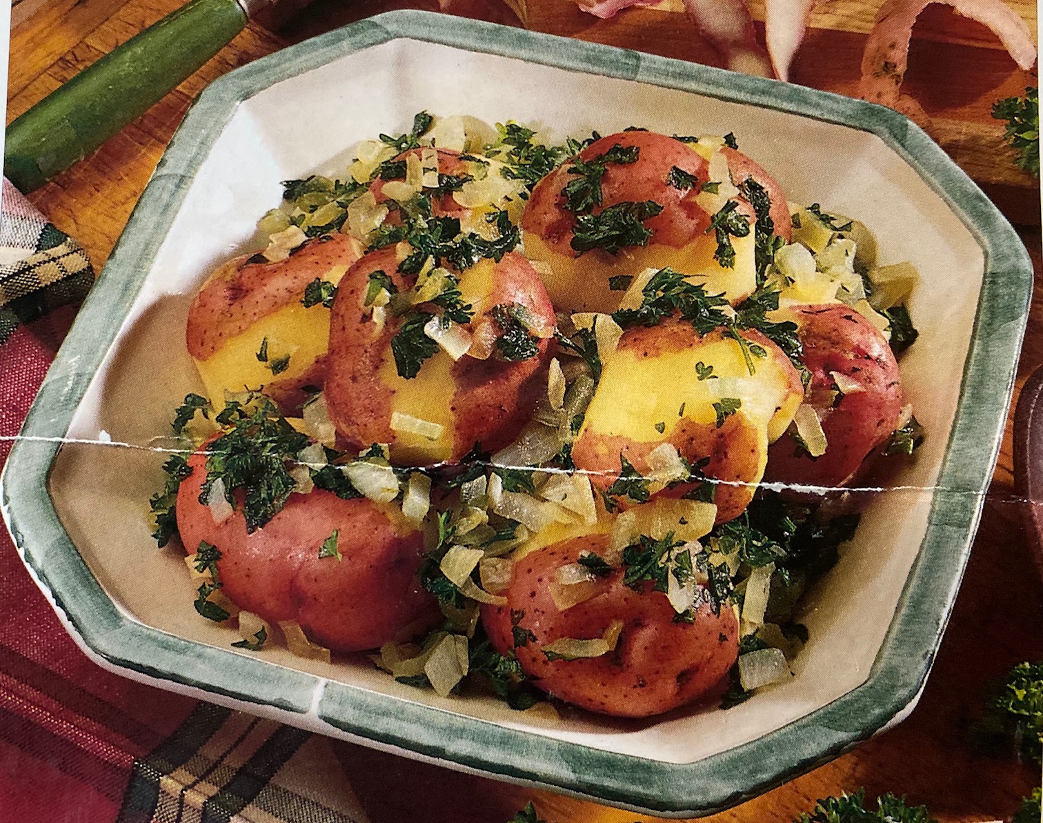 New red potatoes simmered in chicken broth with seasonings and parsley.