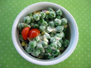In a bowl, combine the peas, cheese and onion. Stir in the mayonnaise and mustard. Cover and refrigerate until serving.