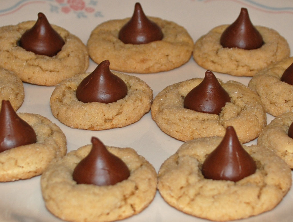 Peanut butter cookies topped with Hershey kisses; also called Peanut Butter Blossoms.