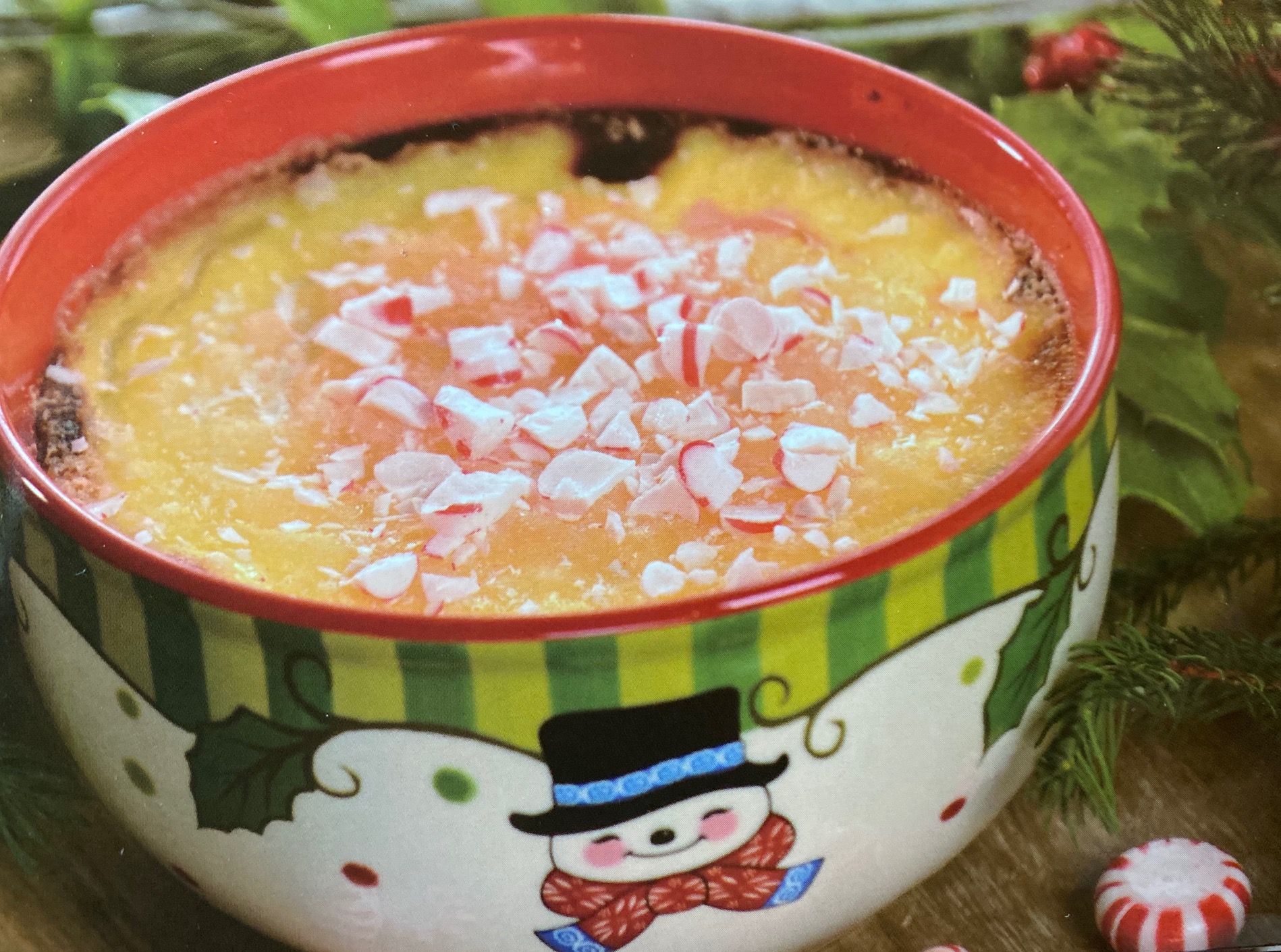 To serve, sprinkle with 2 tablespoons of sugar and caramelize under the broiler or with a blow torch. Sprinkle with crushed peppermints and serve.