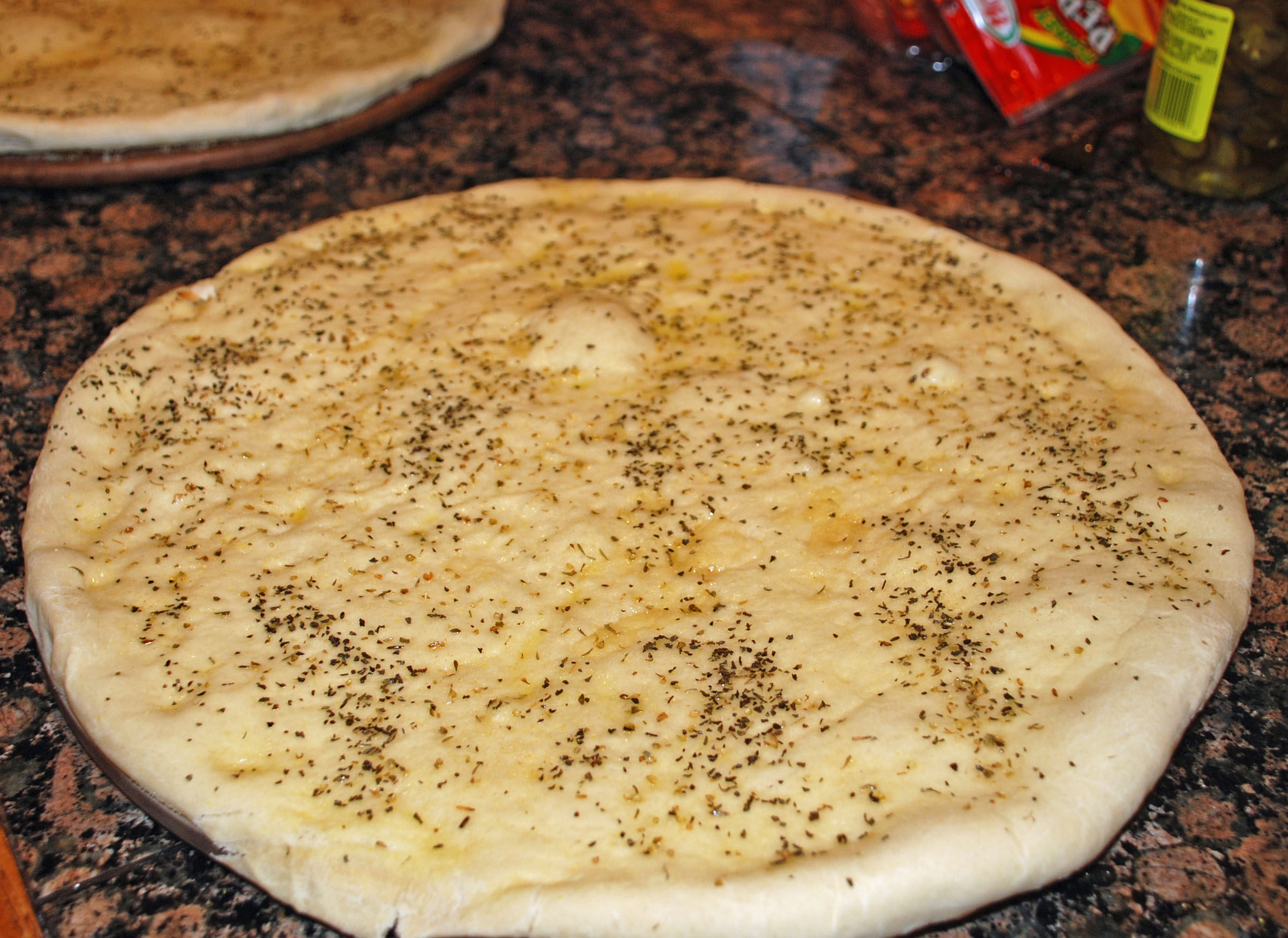 Dissolve the yeast in warm water. Add sugar, salt, and flour. Knead for 10 minutes, then let rise (for about 1 hour). Roll dough onto pan or pizza brick. Brush dough with olive oil, and cover with seasonings to taste (italian seasoning, garlic, etc.). Bake for 5 minutes, remove from oven and put sauce and toppings. Put back in oven for 5-7 minutes. Makes enough for 2 round pizza bricks.