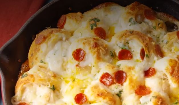 Place stuffed knots in the skillet. Brush remaining butter mixture onto dough and sprinkle with more mozzarella and pepperoni.