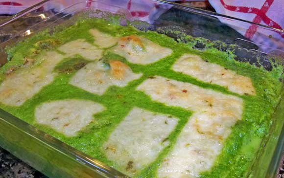 Melt the remaining 2 tablespoons butter in a skillet and saute chicken breasts until nicely browned. Turn and sauce on the second side for just a minute or two. Place them in a buttered baking dish. Pour the poblano cream sauce over all and top with grated cheese. Bake uncovered in a 350 F oven for 20 minutes. The cheese should be golden and bubbly.
