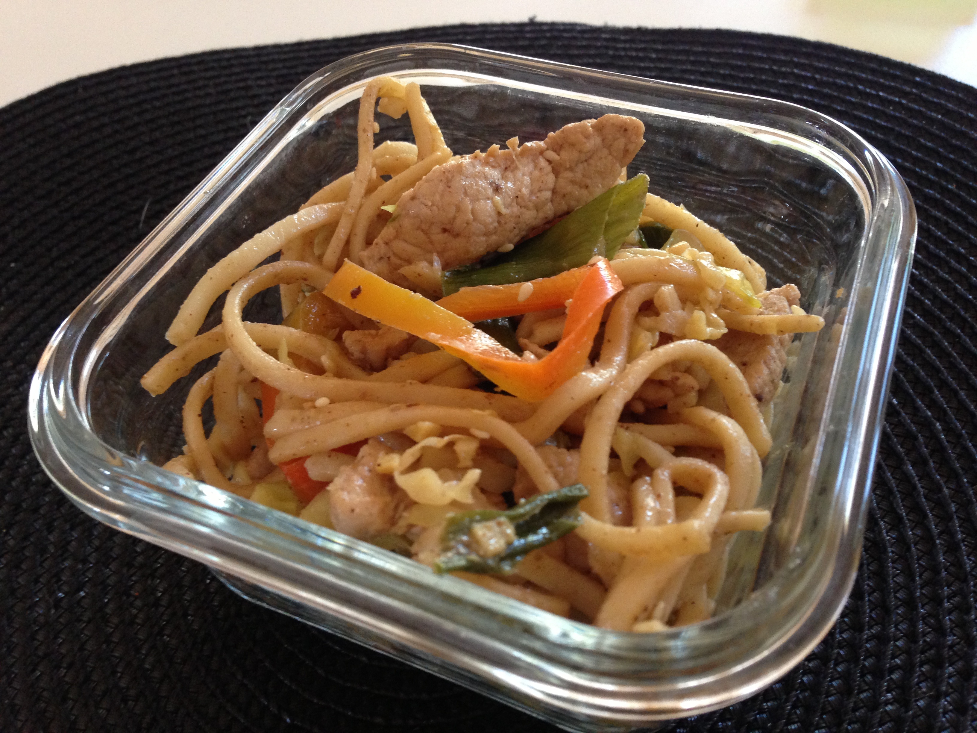 One dish meal! Meat, veg, noodles all together in this stir fry. Add any veggies you like to bulk this bad boy up! Skip the swine and add more veg/tofu/portabella for a great vegetarian meal!