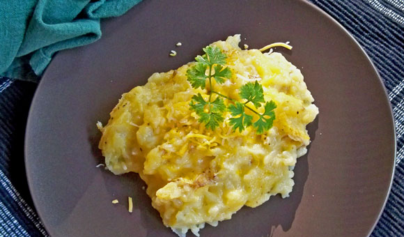 Cook unpeeled potatoes in boiling water until tender, about 20-25 minutes, depending on size of potato; let cool, then peel (or not, if you prefer), and coarsely shred.