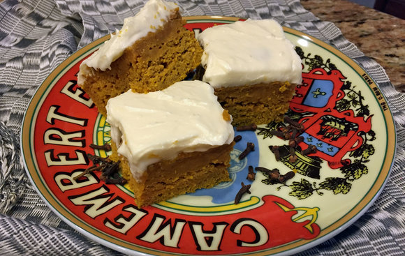4. To make the frosting, cream together the cream cheese and butter. Stir in vanilla. Add powdered sugar a little at a time, beating until mixture is smooth. Spread evenly on top of the cooled bars.