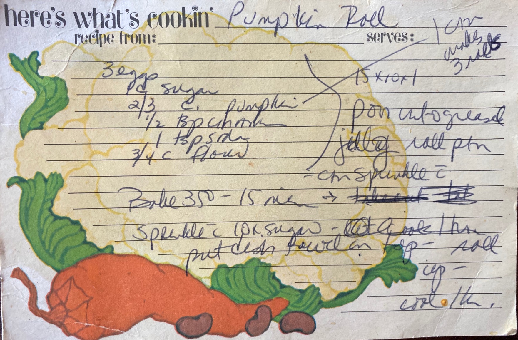 Pumpkin cake rolled up with cream cheese filling and nuts, if desired.