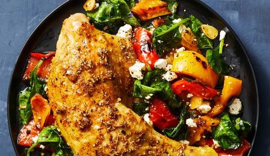 Transfer chicken to plates, scatter baby spinach over the peppers remaining on baking sheet and toss until just beginning to wilt. Sprinkle with crumbled feta cheese and serve with chicken.