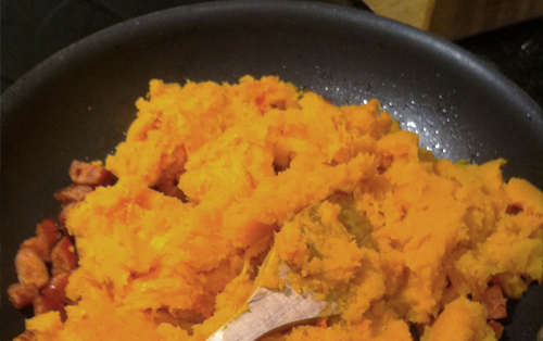 Scoop squash out of shell and into the pot with the sausage. Stir in the seasoning and coconut milk.
