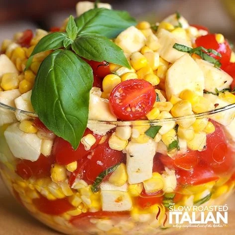1. Cut corn off the cob and place it into a medium mixing bowl. Add tomatoes and mozzarella. Sprinkle with basil, and set aside.
