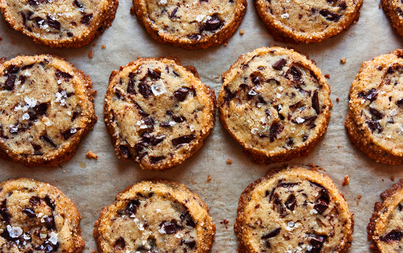 Using a sharp serrated knife, cut logs into 1/2-inch thick rounds. You’re going to hit some chocolate chunks, so saw gently, squeezing the cookie to keep it from breaking if needed. Arrange cookie slices on prepared sheets one inch apart (they don’t spread much) and sprinkle each with a few flakes of salt. Bake for 12 to 15 minutes, or until the edges are just beginning to get golden brown. Let cool slightly before transferring to the cookies you don’t eat immediately to wire racks to cool.