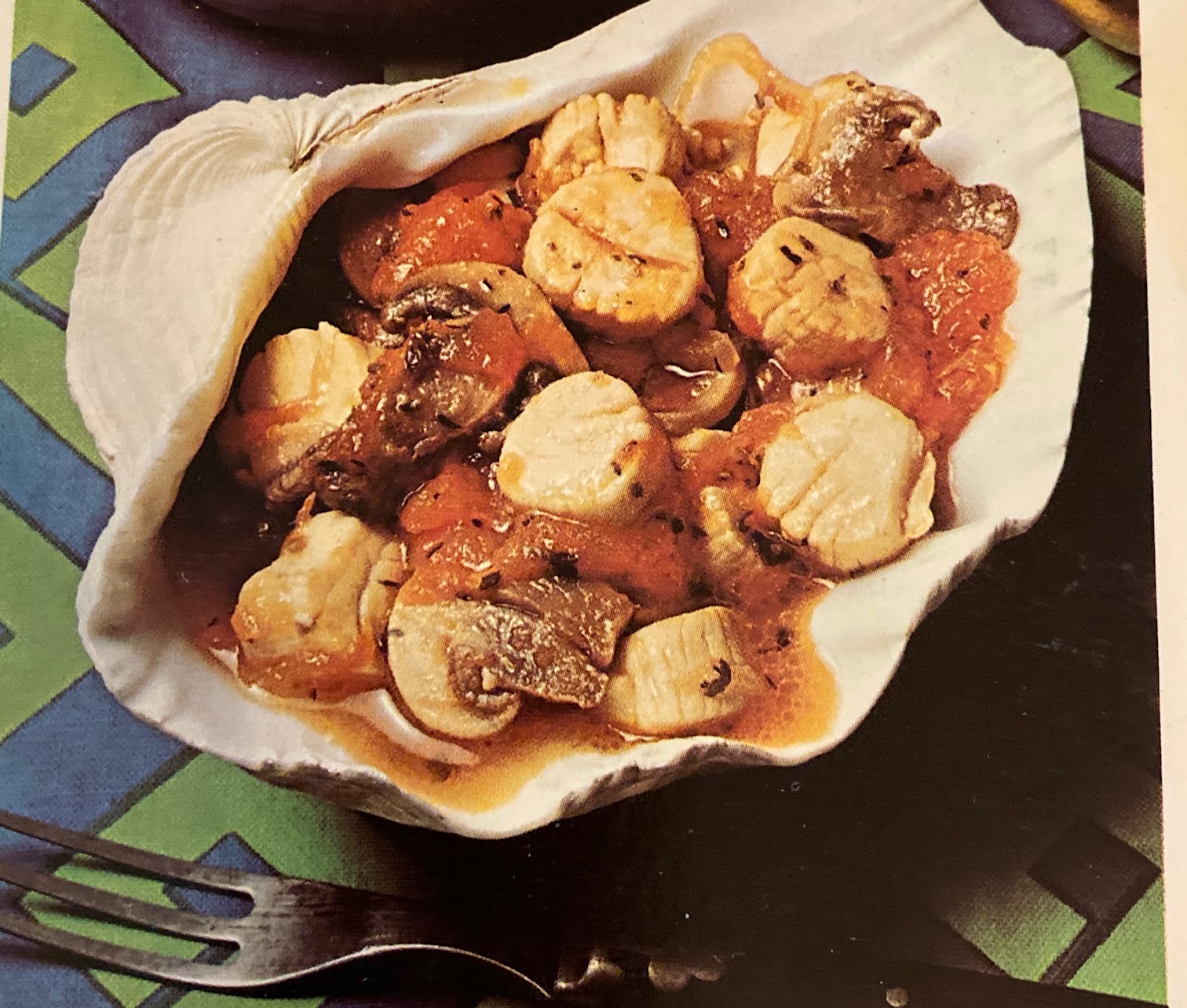 Scallops with mushrooms and seasonings in fresh tomato sauce.