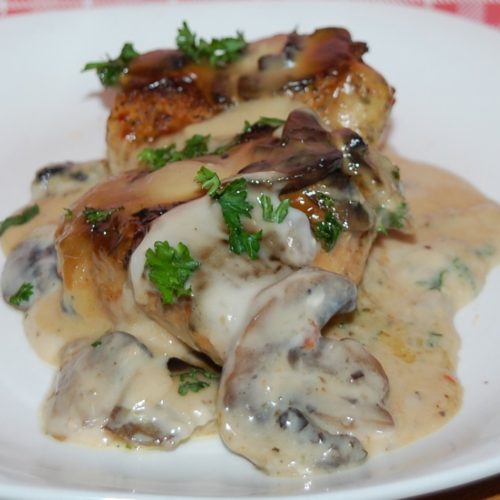 Chicken breasts with bacon, dried beef, cream cheese and cream of mushroom soup; a favorite recipe from Nanny Shirley.