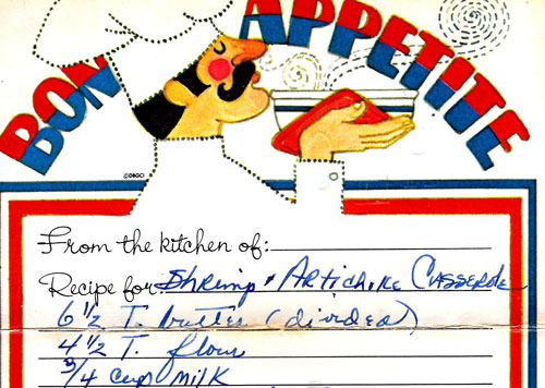 Shrimp, artichoke hearts and mushrooms baked in a creamy sauce.