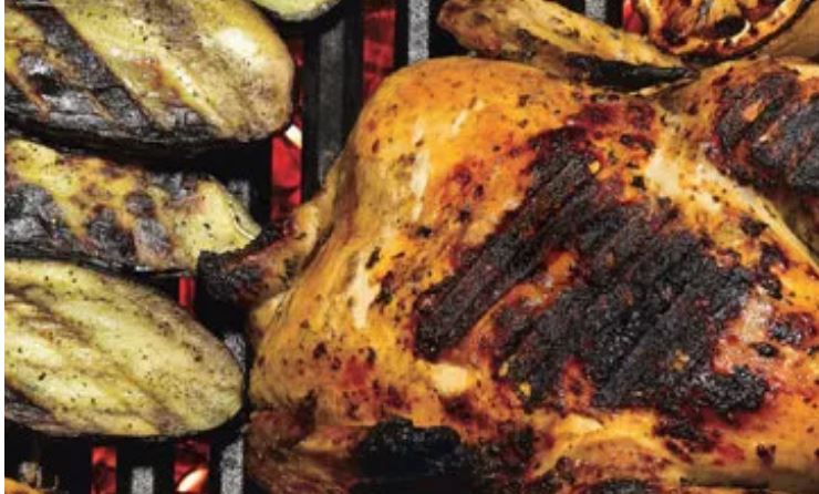 Sicilian roasted chicken on the grill with lemons, artichokes and eggplant.