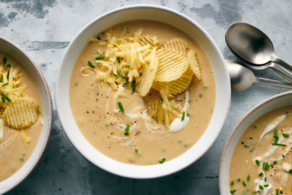 Remove and discard the thyme sprig, and turn off the slow cooker. Add the lemon juice. To make a completely smooth and creamy soup, purée the ingredients using an immersion blender. (Or, purée the soup in a blender in two batches, transferring the puréed soup to a different pot.) To make a textured, chunky soup, smash the ingredients using a potato masher in the slow cooker. Stir in the sour cream and chives. Taste and add additional salt if necessary. Serve in bowls topped with black pepper, crushed potato chips and shredded Cheddar. For leftovers, gently reheat the soup on the stovetop or in the microwave until it just barely bubbles around the edges; don’t let it boil or the sour cream will break.