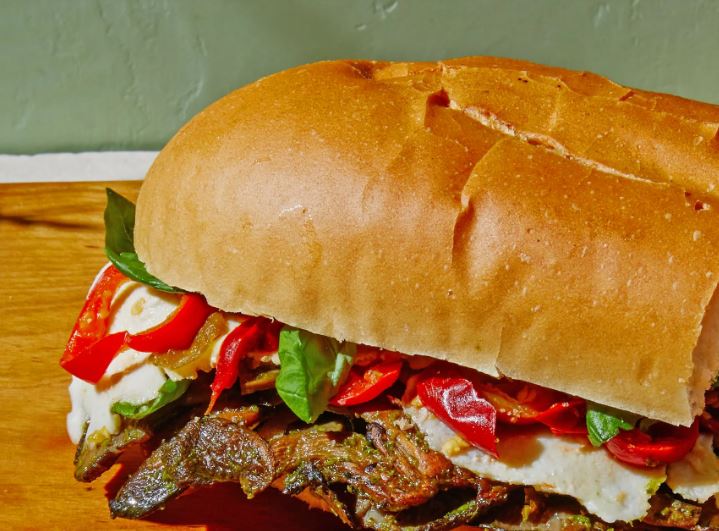 Sandwich made with mushrooms, peppers, mozzarella and pesto.