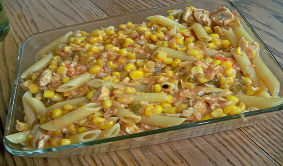 Hearty dish is packed with tender chunks of chicken, corn, and the bite of salsa and chilies.